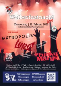 Für das leibliche Wohl ist selbstverständlich bestens gesorgt, und nach dem Programm feiern wir gemeinsam bis in die Nacht – so, wie es sich für eine echte Dawerkuser Weiberfastnacht gehört!