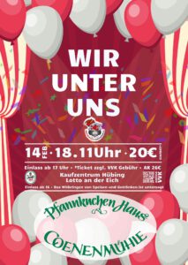 „Wir unter uns“ der bekannte Höhepunkt im Dabringhausener Karneval werden am 14.02.2026 die einheimischen Gruppen und das Dawerkuser Dreigestirn in einem etwa 4-stündigen Bühnenprogramm die Jecken wieder begeistern. Wir bringen die Mehrzweckhalle Dabringhausen endlich wieder zum beben!
